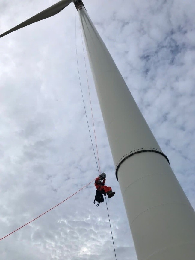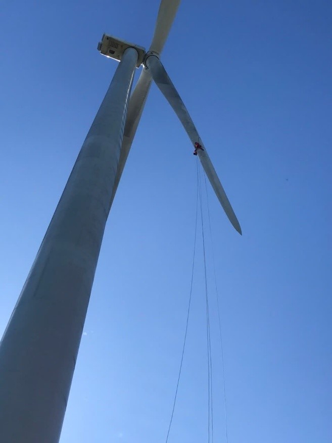 Để xử lý hư hỏng cấp độ cao ở vị trí cánh tua-bin ở độ cao hơn 100 mét, chúng tôi lựa chọn phương pháp tiếp cận bằng đu dây (Rope Access). Đây là giải pháp hiện đại, linh hoạt, được các chuyên gia quốc tế khuyến nghị.